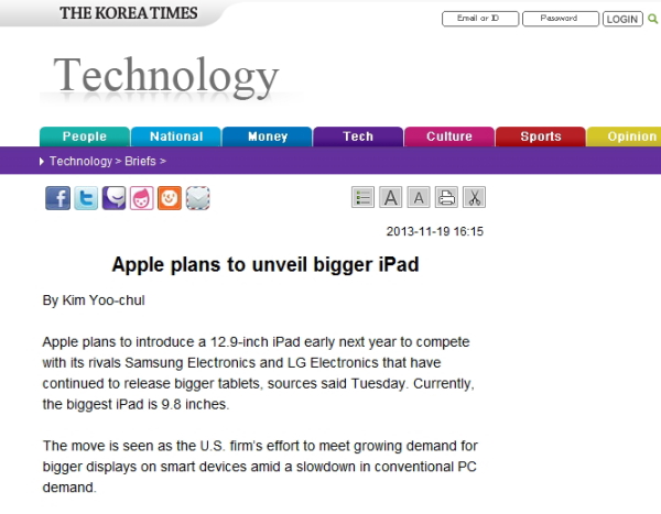 韓国の英語メディアKorea Times(コリア・タイムス)は19日(現地時間)、Appleのディスプレイを製造するサプライヤーからの情報として、次期iPad用の12.9インチRetinaディスプレイを生産していると報じた。
