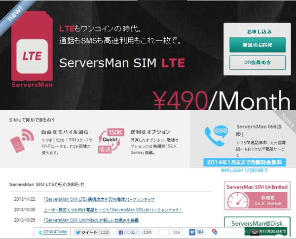 DTI、データ通信サービス「ServersMan SIM LTE」の速度を1.5倍の150kbpsに増速