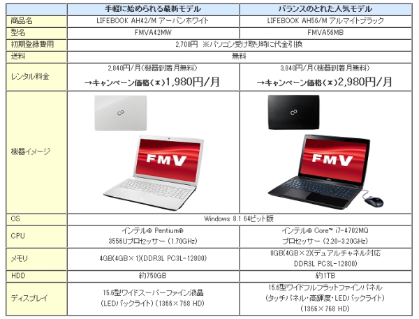 レンタル開始から36カ月間は、水こぼしや落下による破損・損傷などの故障に対して、何度でも無償で修理を受けられるメーカー保証サービスが付くという。また、機器到着翌月から36カ月間レンタル料金が割引となるキャンペーンも実施される。キャンペーン価格が適用されると、「LIFEBOOK AH42/M アーバンホワイト」は月額2079円、「LIFEBOOK AH56/M アルマイトブラック」は月額3129円となる。