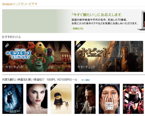 「Amazonインスタント・ビデオ」は、映像コンテンツをKindle FireシリーズとWebブラウザでレンタル・購入して視聴できるサービス。コンテンツは、「おすすめタイトル」「1000円、HD1500円セール」「第1話無料配信」「日本映画のおすすめ」「外国映画のおすすめ」「日本のTVドラマ」「アメリカのTVドラマ」「アニメのおすすめ」「お試しキャンペーン」「キッズ&ファミリーのおすすめ」に分れる。