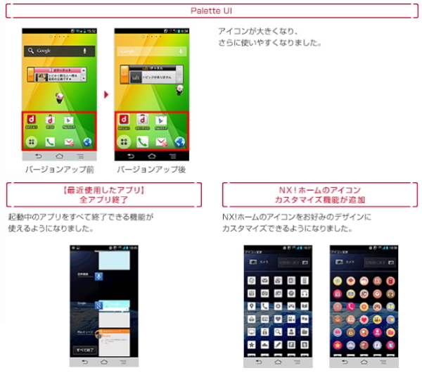 「ARROWS V F-04E」は2012年冬モデルの約4.7インチHDディスプレイ搭載Androidスマートフォン。今回のアップデートでは、「Palette UI」のアイコンが大きくなり使いやすくなっている。また、起動中のアプリを全て終了する「最近使用したアプリの全終了」が追加され、「NX!ホーム」のアイコンを好きなデザインにカスタマイズできるようにもなっている。ほかには、プリインストールのブラウザで、選択した文字を辞書で引いてフキダシ表示する「すぐ辞書」機能追加や「ロック画面の改善」が行われている。