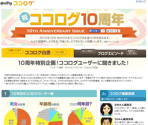 ニフティの「ココログ」が10周年、特設サイトで「ココログ白書」も公開