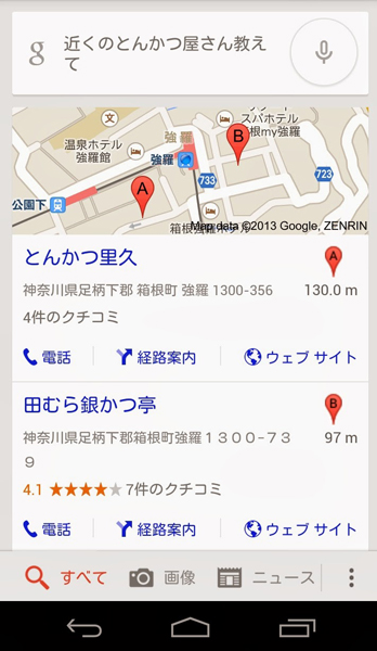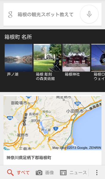 新しい音声検索では、話し言葉を理解して音声で応答する。入力しづらいときや画面が見られないような状況でも、会話するように知りたい情報をすばやく調べられる。たとえばドライブする際に「大涌谷まで車で行きたい」と言えば経路検索の画面が立ち上がり、「箱根の天気は?」と聞けば「箱根町の天気は15度で曇りです」と答える。飲食店を検索したい場合は「近くのとんかつ屋さんを教えて」と言えば周囲の店を検索できる。