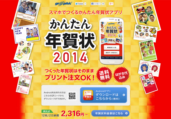続いて紹介するのが、グラフィックから先日リリースされた、年賀状作成アプリ「かんたん年賀状2014」。デザイナーが手掛けた約50種のテンプレートが用意されており、写真の取り込みや手描き入力が可能。作成した年賀状は、そのまま端末からプリント注文でき、送料無料/お年玉年賀はがき代込みで手元まで届けられる。Android 4.0~4.2対応で、アプリは無料ダウンロードして使用することが可能だ。