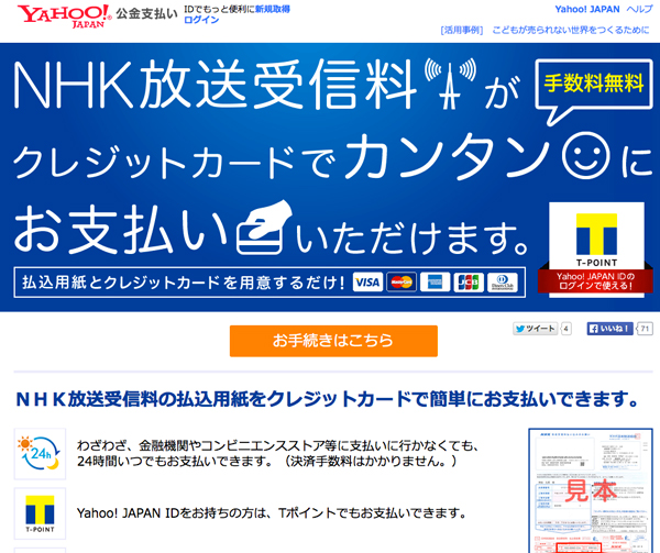 ヤフー、「Yahoo!公金支払い」でNHK受信料の取り扱いを開始