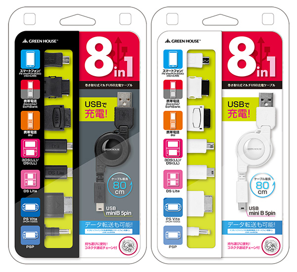 株式会社グリーンハウスは、マルチUSB充電ケーブル「GH-UCCM8Aシリーズ」を12月下旬に発売する。自動巻き取り式タイプのモデルで、約10〜80cmの間でケーブル長の調節が可能。カラーバリエーションとして、ブラック/ホワイトの2色が用意されている。価格はオープン。