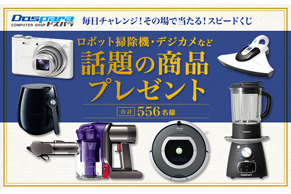 本キャンペーンは、ドスパラ公式Facebookページに「いいね!」を押し、応募ページからの手続きを行うことで参加が可能。ロボット掃除機「iRobot ルンバ780」(1名)やデジタルカメラ「サイバーショット DSC-WX300」(1名)をはじめ、さまざまな賞品が抽選で当たり、計556名へのプレゼントが行われる。抽選はスピードくじ方式で、期間中のチャレンジは1日につき1回。当選者には、モニプラ社マイページへの通知と、モニプラ社への登録メールアドレスへの当選発表メールの送信が行われる。