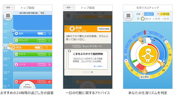 本サービスは、リストバンド型活動量計「ムーヴバンド」(12月18日発売:市場予想価格1万円弱)とドコモスマートフォンにインストールしたアプリで活用できる健康管理サービス。「ムーヴバンド」で記録した睡眠時間や食事時間などを入力することで、ユーザーに合った24時間の過ごし方を提案したり、ダイエット・疲労回復・アンチエイジングの方法をアドバイスする。