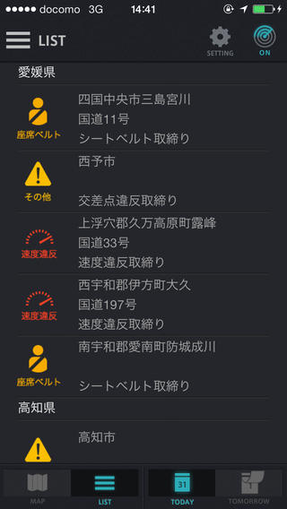 同アプリは、全国の都府県警が公開する交通取締計画(いつ、どこで、どんな取締を実施するか)を配信してくれるアプリで、交通取締エリアに近づくとサウンド付きで通知してくれる機能を搭載。レーダー通知機能をONにしておけば、アプリを立ち上げていなくても取締エリアに入った際に画面上にサウンド付きで通知してくれるほか、表示モードは地図上から探せる「MAPモード」と一覧リストから探せる「LISTモード」から選ぶことが可能だ。