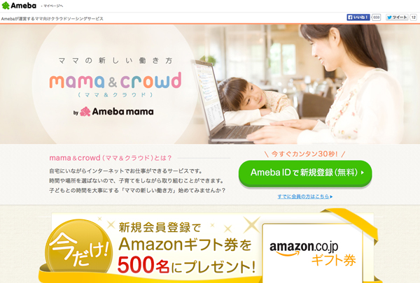 株式会社サイバーエージェントは、同社運営の「Ameba」において、ママ向けクラウドソーシングサービス「mama&crowd(ママ&クラウド)β版」の提供を開始した。