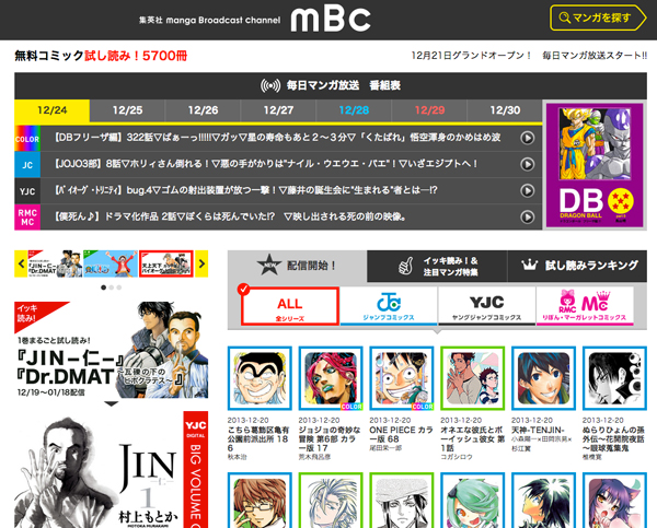 株式会社 集英社は、5700冊を超えるデジタルコミックスの試し読みが可能なポータルサイト「Manga Broadcast Channel(マンガ・ブロードキャスト・チャンネル)」を公開した。