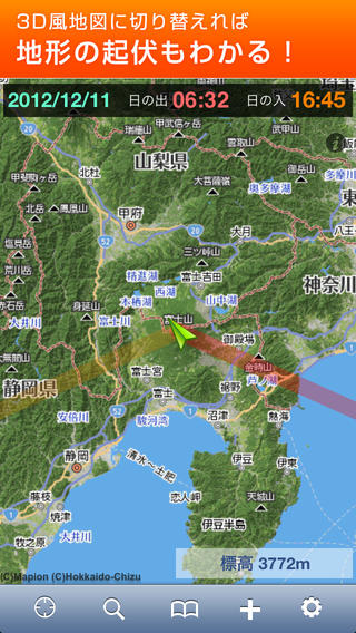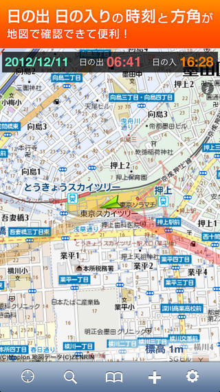 同アプリは、初日の出参り、山登り、写真撮影などさまざまなシーンで利用できる、日の出・日の入り情報アプリ。Android版とiOS版の両方で提供されている。地図上の矢印で端末の向きも確認できるほか、矢印をタップすると矢印の地点の日の出・日の入情報に加え、住所や緯度経度、月の出・月の入りの時刻も表示してくれる。また、ブックマーク登録機能も搭載している。
