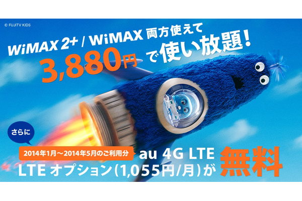 LTEオプション料は、HWD14でWiMAX 2+とau 4G LTEを使える「ハイスピードプラスエリアモード」を使用した月のみ発生する料金で、従来は利用月のみ1055円を支払う必要があったが、キャンペーン期間中は無料となる。これにより、WiMAXとWiMAX 2+、au 4G LTEを月額3880円で利用可能となる。