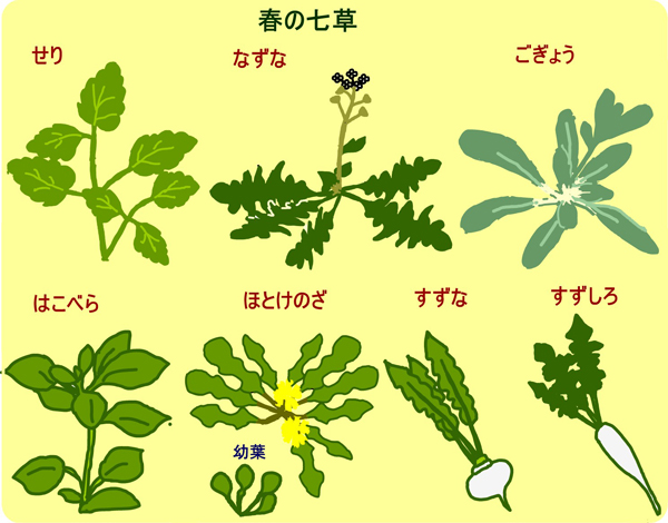 ちなみに七草とは、芹(せり)、薺(なずな)、御形(ごぎょう)、繁縷(はこべら)、仏の座(ほとけのざ)、菘(すずな)、蘿蔔(すずしろ)を指し、現在の名称で言うと、芹はセリ(セリ科)、薺はナズナ(アブラナ科)、御形はハハコグサ(キク科)、繁縷はハコベ(ナデシコ科)、仏の座はコオニタビラコ(キク科)、菘はカブ(アブラナ科)、蘿蔔はダイコン(アブラナ科)を示します。