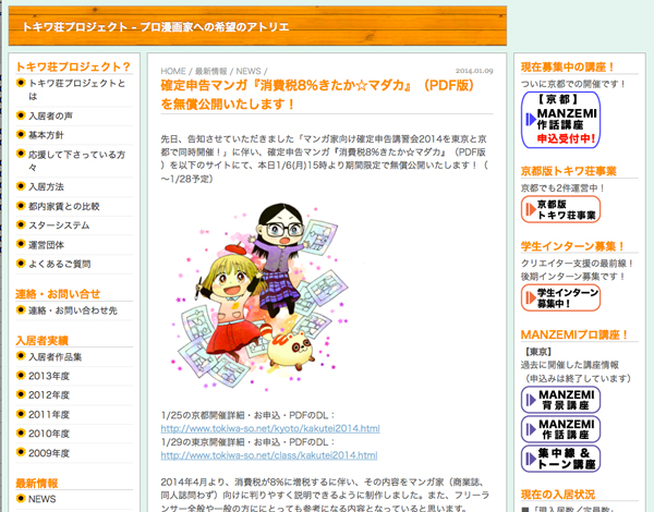 トキワ荘プロジェクトは、漫画家(商業誌、同人誌問わず)向け確定申告マンガ『消費税8%きたか☆マダカ』(PDF版)を期間限定で無償公開した。公開期間は2014年1月28日(火)までを予定している。