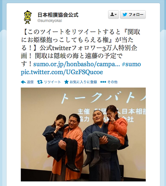 日本相撲協会は、Twitter公式アカウントのフォロワーが3万人を突破したことを記念し、ツイートをリツイートした人の中から抽選で「関取にお姫様抱っこしてもらえる」権が当たる特別企画を実施中だ。