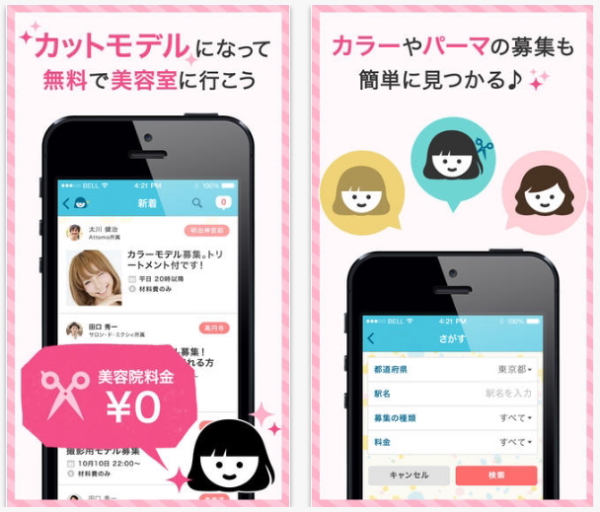 本アプリは、計50万人以上が使用した、mixi内のカットモデル募集コミュニティから誕生したアプリ。美容師はカット、カラー、パーマ、日時、場所などの条件を入力。カットモデルを希望する人は、条件の合う美容師の投稿に、応募するだけで無料でカット、カラー、パーマができる。