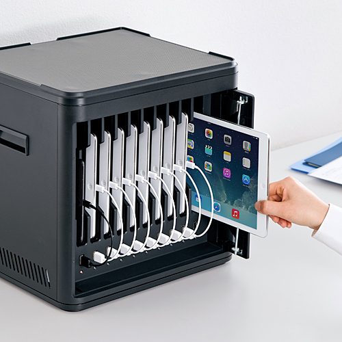 同製品はタブレットを10台収納可能な収納保管庫で、2.1A出力のUSBポートを10ポート搭載しており、タブレットをまとめて10台充電できる。PCに接続して充電モードから同期モードに切り替えることが可能で、単体使用でiPadであればAppleConfiguratorを利用して10台の同期も一度に行える。