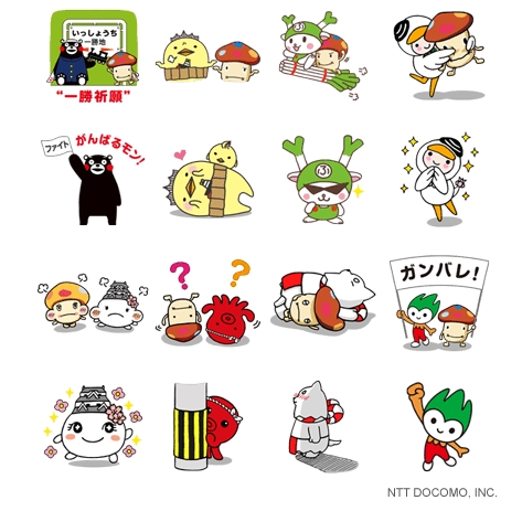 ドコモダケと熊本県のご当地ゆるキャラ「くまモン」などがコラボして、受験シーズンまっただ中の学生を応援しているのは「ドコモダケ×ご当地キャラ」スタンプ。「くまモン」や山口県のPR本部長「ちょるる」の応援スタンプなどが揃っている。※NTT ドコモのLINE公式アカウントの「友だち」追加が必要