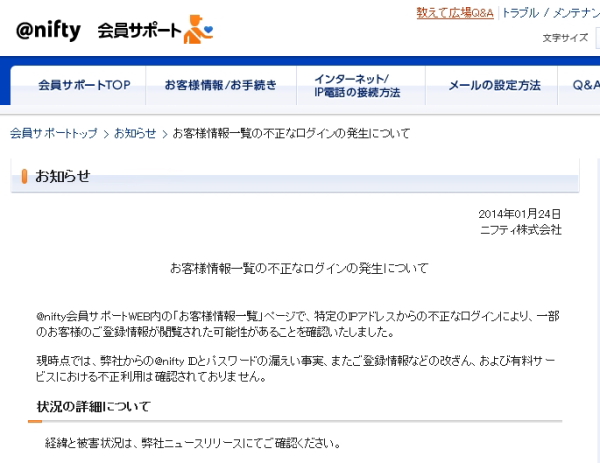 またもやニフティで不正ログイン--165件の住所氏名などが閲覧された可能性