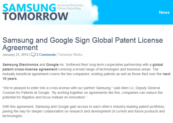 サムスンとGoogle、10年に渡りお互いの特許を利用し合う特許クロスライセンスに合意