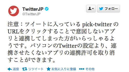 このスパムツイートの内容はデマで、ほかにも「真のワンピースの正体とは!?」「松本潤と井上真央電撃婚」などさまざまなパターンがある。さらに情報を得るためには「詳細はこちら」をクリックしアプリ認証へ誘導するという手口だ。認証してしまった場合自分のアカウントからスパムツイートが投稿され、さらにスパムツイートが拡散してしまう。安易に怪しいツイートに含まれるリンクをクリックしたり、アプリを認証しないようにすることが大切だ。また、万が一アプリを認証してしまった場合はTwitterの「設定」の「アプリ認証」で許可を取り消すことができる。
