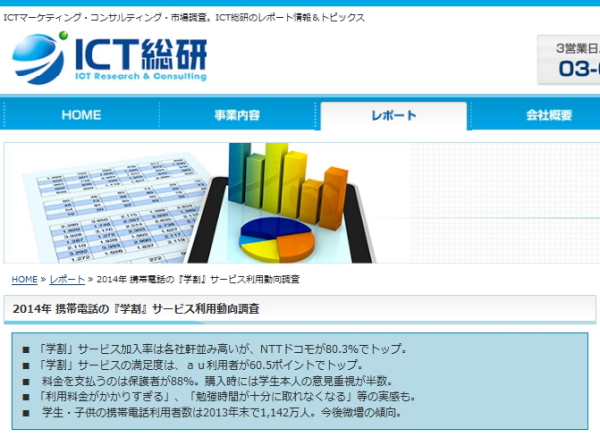 株式会社ICT総研は3日、2014年携帯電話の「学割」サービス利用動向調査の結果を発表した。調査対象は携帯電話を利用する学生(小・中・高・大・院生・短大・専門)の子供を持つ親1000人。