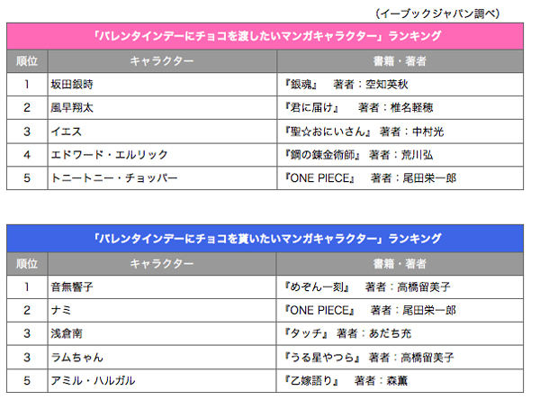 また、第2位はランキング唯一女性向けマンガ『君に届け』から風早翔太がランクインしたほか、『聖☆おにいさん』のイエスが第3位だった。さらに、「バレンタインデーにチョコを貰いたいマンガキャラクター」の第1位は『めぞん一刻』の音無響子に。第2位は『ONE PIECE』のナミ、第3位は『タッチ』の浅倉南と『うる星やつら』のラムちゃんが同率だった。