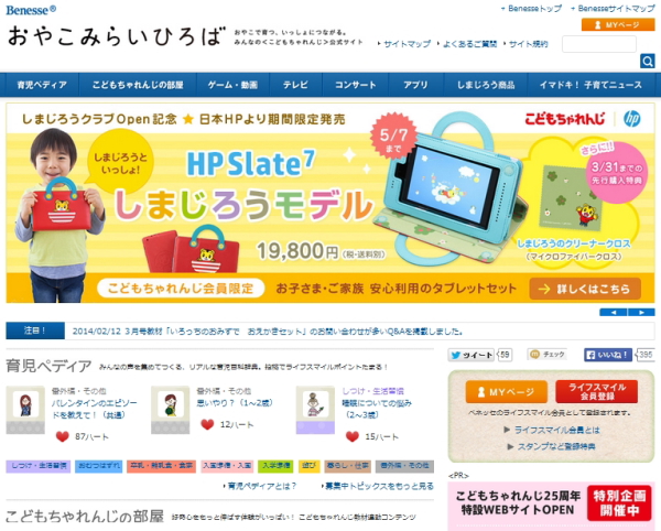 株式会社ベネッセコーポレーションは12日、幼児向けの通信教育講座「こどもちゃれんじ」会員向けの新サービス「しまじろうクラブ」を利用できる、会員専用タブレット「HP Slate7 しまじろうモデル」を発売開始すると発表した。タブレットは2月12日~5月7日までの期間限定販売で価格は2万790円。