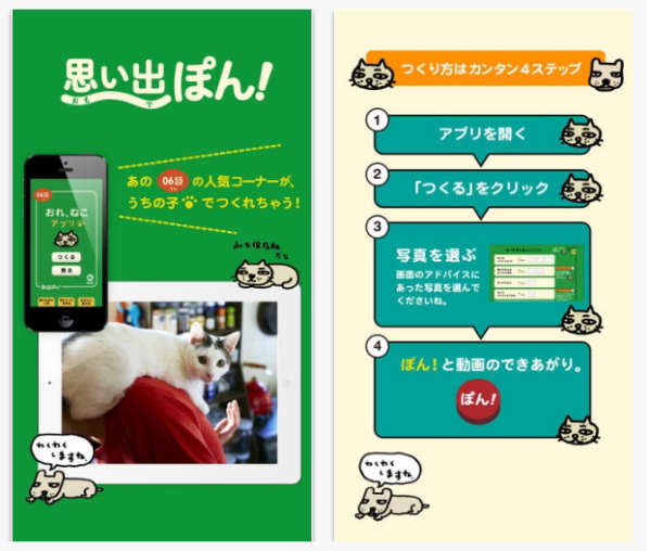 「思い出ぽん!」シリーズは、NHK Eテレ「0655」で人気になっている、犬猫写真投稿コーナー「ねこのうた」を再現したアプリ。ユーザーが撮影した愛猫写真を、簡単にスライドショーにできるようになっている。3本のアプリは機能面は同じで、それぞれ歌が違う仕様になっている。