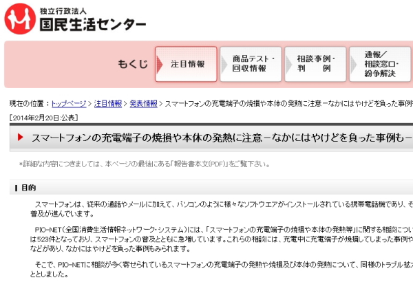 独立行政法人 国民生活センターは20日、PIO-NET(全国消費生活情報ネットワーク・システム)によせられた「スマートフォンの充電端子の焼損や本体の発熱等」に関する相談が、急増していると発表した。