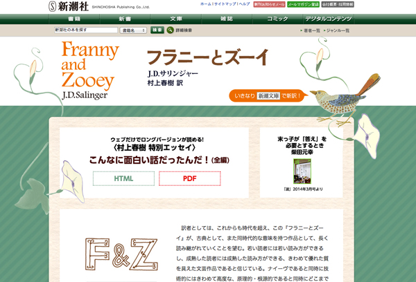 新潮社は、村上春樹さんが翻訳した『フラニーとズーイ』(J・D・サリンジャー著)が2014年2月28日(金)に刊行されることを記念し、村上春樹さんの書き下ろし特別エッセイ「こんなに面白い話だったんだ!(全編)」をHTML版とPDF版で公開した。