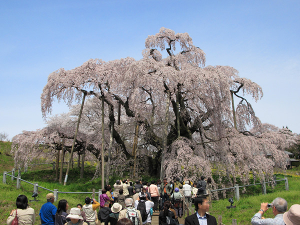 樹齢1000年を超えるベニシダレザクラ。枝の広がりは東西25m、南北20mあり、国の天然記念物。周辺は遊歩道が整備されているので、美しい桜を見ながら散策が楽しめる。