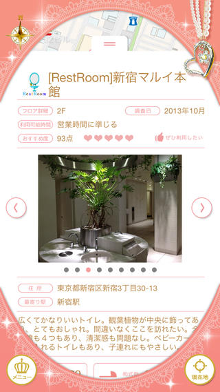 女性が欲しいコンテンツ上位ランクインの「きれいなトイレ」詳細情報も収録しており、同社が独自に調査したトイレ情報を写真とコメント付きで掲載している。パウダースペースやコンセント、フィッティングスペースの有無なども確認できる。