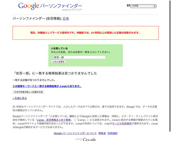 Google パーソンファインダーでJ-anpiに登録された情報の検索が可能に