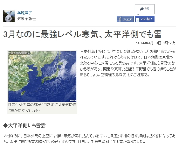 一般財団法人日本気象協会は10日、天気予報Webサイト「tenki.jp」において、年に1・2度の「最強レベル寒気」が流れ込み、3月10~11日にかけて日本海側の東北や北陸は大雪になると発表した。関東太平洋側の平野部については、雪が舞うことがあるとしている。