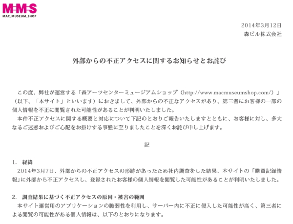 原稿執筆時の現在、被害拡散防止のために「森アーツセンターミュージアムショップ」は一時閉鎖され、アクセスしても「外部からの不正アクセスに関するお知らせとお詫び」の掲載のみとなっている。
