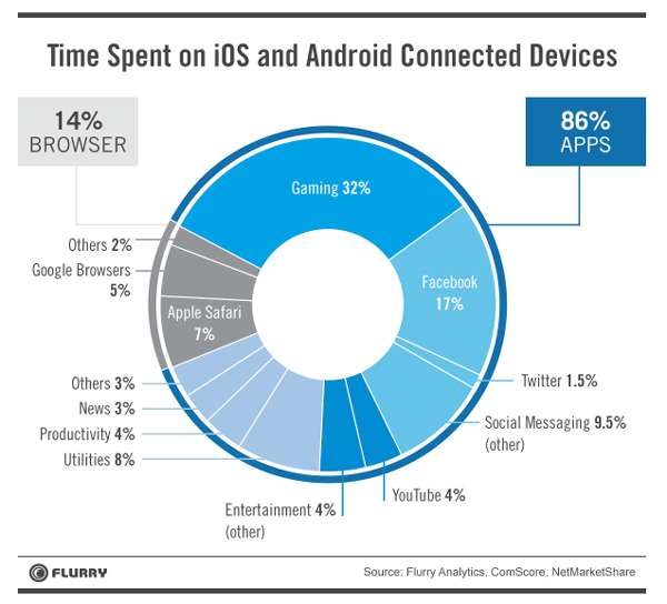 発表によると、2013年3月時点で米国のユーザーがモバイル端末を利用する時間は1日あたり平均2時間38分でアプリ利用が80%、Webブラウザ利用が20%だった。一方、今回の調査では1日あたり平均2時間42分に増加。前回に引き続きアプリ利用時間がリードしており86%、Webブラウザ利用時間は14%となった。同社は「モバイルWebブラウザはアプリの大海原を泳ぐ一つの存在に過ぎなくなった」とコメントしている。また、最も多く使われているアプリはゲームで32%。次いでFacebookが17%、ソーシャルメッセージングサービスが9.5%という結果になった。