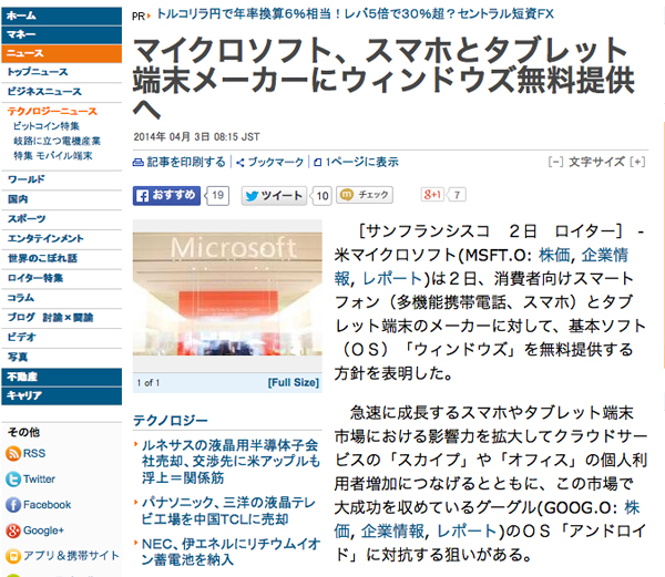 米Microsoftは、一般ユーザー向けスマートフォンおよびタブレット端末のメーカーに対し、「Windows」を無償提供するとコメントした、とロイターが伝えている。