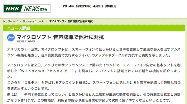 またCNNの記事によると、同機能はAppleの「Siri」やGoogleの「Google Now」に対抗しているが、独自機能として「Bing」で音声検索した内容をほかのアプリに受け渡すことができると伝えている。