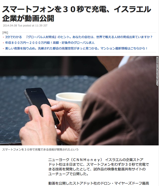 イスラエルの新興企業StoreDot社が、スマートフォンを30秒で充電できる技術を開発したとして試作品の映像をYouTubeで公開したとCNNが報じている。この技術はテルアビブ大学のアルツハイマー研究から生まれたとしている。