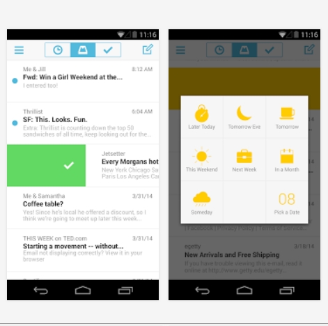 本アプリは、iOS版で人気を博したアプリ。利用開始のためには、希望者の順番待ちという実店舗のようなシステムを導入したことでも話題になった。特徴は、メールをスワイプすると、「アーカイブ」や「削除」、「リスト」「後で処理」などに振り分けられること。アラームと連動して、メールを読むように通知することもできる。