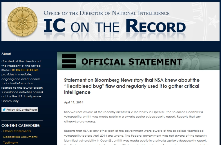 この報道に対し、NSAは否定する声明文を発表。NASは民間のサイバーセキュリティ報告で知るまで、「Heartbleed」については認識していなかったとしている。政府のWebサイトやその他のオンラインサービスの利用者のプライバシー保護のために、OpenSSLに依存しており、もし脆弱性を発見した場合は、その脆弱性を公開していたと主張した。