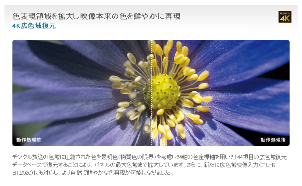 本製品は、パネルに直下型広色域LEDを採用し、色域を約30%拡大して色彩はより豊かに、そして緻密な映像表現を実現した4Kテレビ。色表現に関しては、デジタル放送の色域に圧縮された色を広色域復元データベースで復元し、さらに広色域映像入力(ITU-R BT.2020)にも対応することで、自然で鮮やかな色再現を可能にしたという。