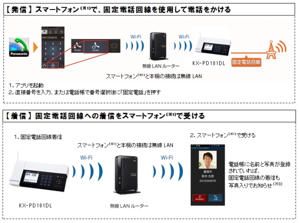連携機能では、受信したファックスの画像をスマートフォンに表示したり、スマートフォンの電話帳から固定電話回線で音声通話を発信したり、固定電話への着信をスマートフォンで受けることができる。また、本製品をインターネットに接続することで、ファックス受信画像や留守番電話への用件録音、窓/ドア/人感センサー(別売)の通知をスマートフォンに転送できる。
