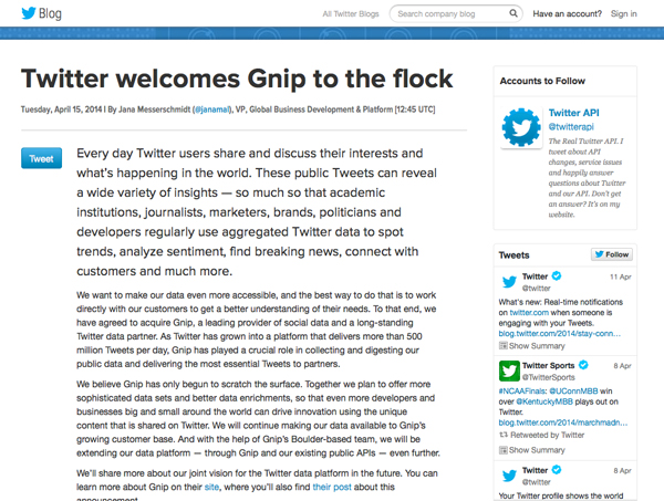 Gnipは2008年に米コロラド州に設立され、以前からTwitterのデータ収集などで提携関係にあった。また同社は、Flickr、YouTube、Google+といったソーシャルサービスとも提携をしている。今回の買収でTwitterは、より洗練されたデータセットと付加価値を世界中の開発者や企業に提供できるとコメントしている。