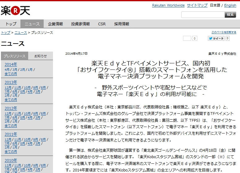 楽天Edy株式会社は17日、決済プラットフォーム事業を展開するTFペイメントサービス株式会社との協力により、「おサイフケータイ」搭載スマートフォンで、電子マネー「楽天Edy」を利用できるプラットフォームを開発したと発表した。