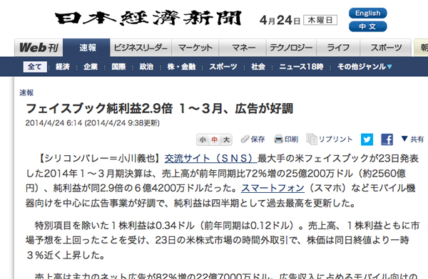 Facebookは2014年1-3月期決算を発表した。発表によると売上高は25億200万ドル(約2560億円)で前年同期比72%増、純利益は6億4200万ドルだったと日本経済新聞Web版で伝えている。