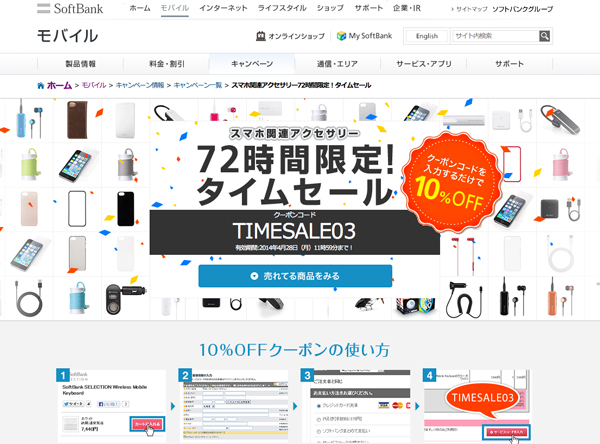 ソフトバンクモバイル株式会社は、同社運営のオンラインショップ「SoftBank SELECTION」において、2014年4月25日(金)12時から4月28日(月)11時59分までの間、スマートフォン関連アクセサリー全品10%オフのタイムセールを実施している。