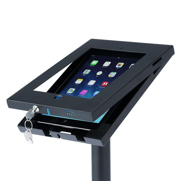 今回発売された3タイプの製品は、いずれもアタッチメントが付属しており、iPad Air、iPad(第3~4世代)、iPad2をピッタリと収納させることが可能。同じく付属のパーツを用いて、ホームボタンを押せないように設定することもできる。背面には配線のための穴とケーブルガイドが設けられており、充電しながらの操作にも対応。台座部分には床固定用の穴があり、固定することで安定した設置を実現できる。